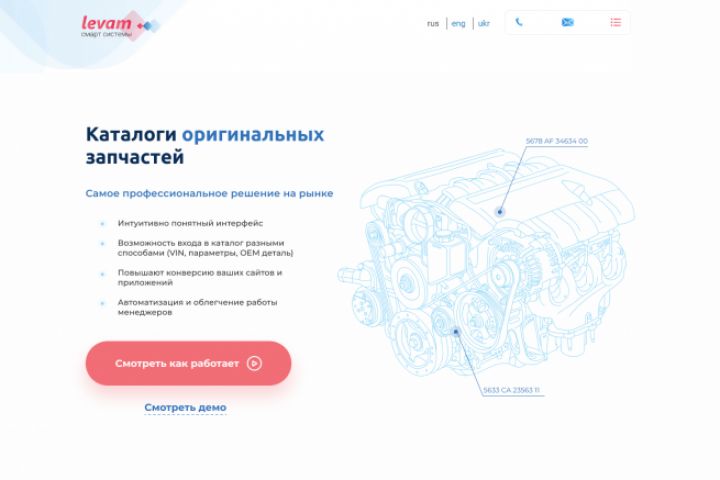 Верстка одностраничного сайта "Levam" из Figma для сервиса по подбору автомобильных запчастей.