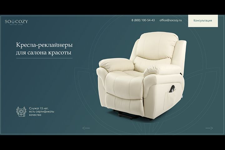 Верстка одностраничного сайта по продаже кресел "Socozy". Ссылка на сайт на моем хостинге: https://site19.zaryaweb-portfolio.site