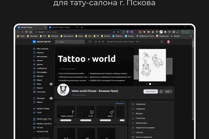 Оформление в индивидуальном стиле для тату-салона: дизайн шапки, баннер, обложка, виджеты, товары, айдентика