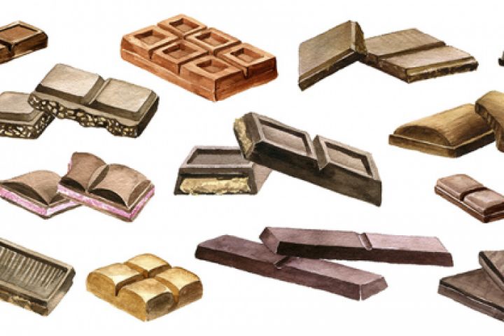 Акварельная иллюстрация разных сортов и видов шоколада.