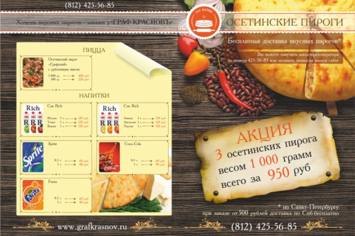 Рекламная брошюра А5 для осетинских пирогов. Складывается пополам. Внутри находится меню с ценами на все пироги.