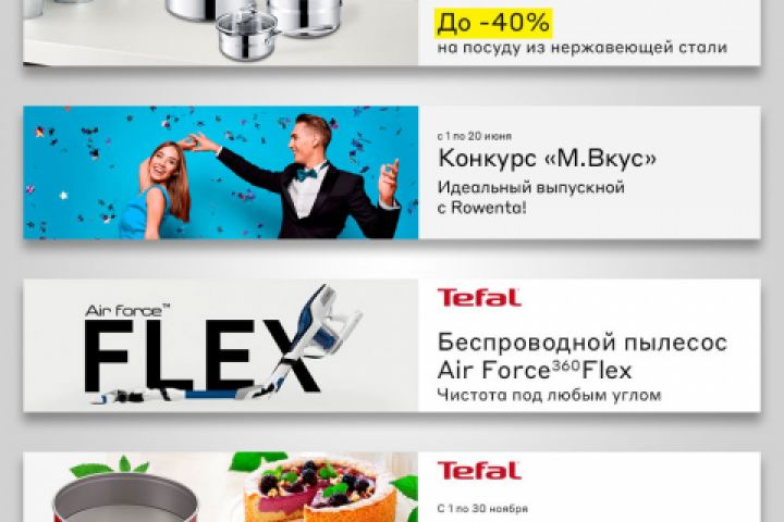 Дизайн рекламных интернет-баннеров брендов Tefal и Rowenta для сайта М.Видео.