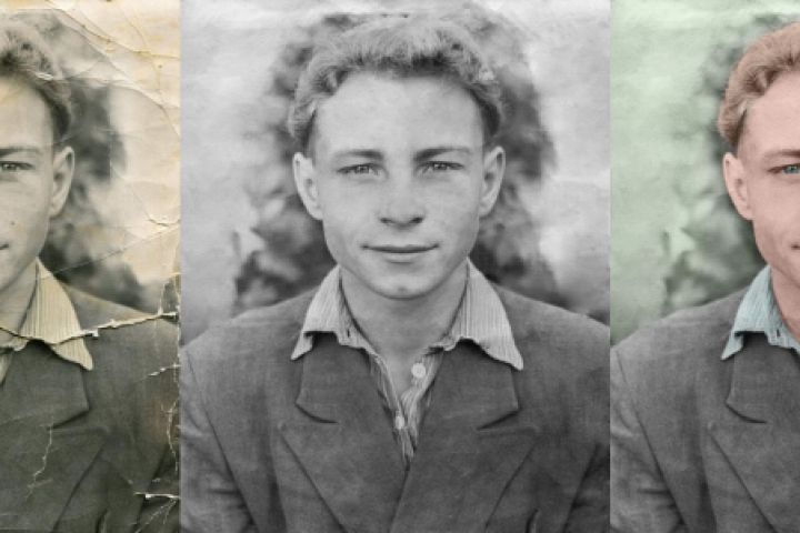 Удалены дефекты фото (разрывы, пятна). Придание цвета чёрно-белой фотографии.
