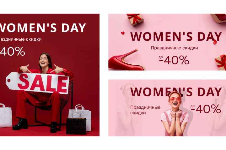 Задача: Разработать 3 баннера рекламирующие акцию "Women's day", посвященную международному женскому дню.