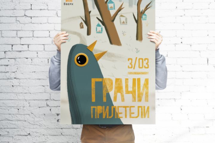 Задача: Иллюстрация для благотворительного центра «Вверх». Афиша рассказывает о том, что студенты центра будут собирать кормушки для птиц и поедут с ними на природу.