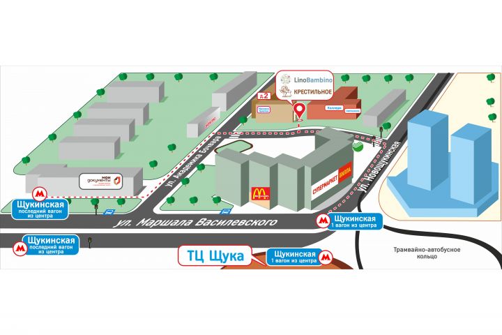 Задача: отрисовать район, где находится ЖК Щука, основные дороги, метро. Вектор.