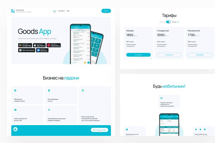 Задача: разработать дизайн одностраничного сайта для приложения учет товаров Goods App.