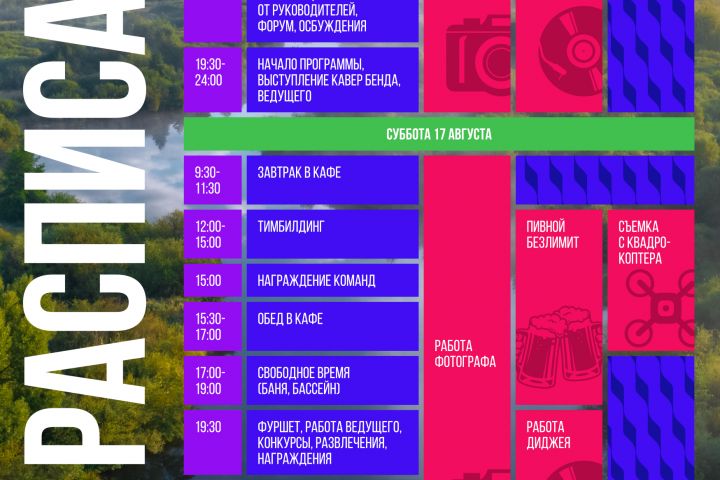 Расписание выездного корпоратива для компании с миллиардным оборотом.