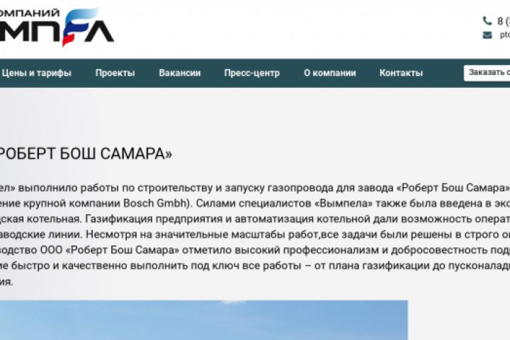 Новость для компании "Вымпел Групп" о выполнении работ по строительству и запуску газопровода для завода "Роберт Бош Самара" (подразделение крупной компании Bosch Gmbh). Уникальный текст с ключевыми словами. Работа выполнена в течение часа.