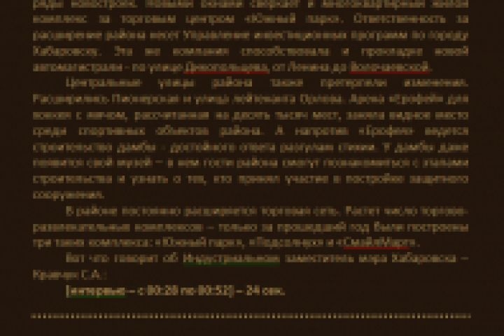 Текст для видеоролика об Индустриальном районе г. Хабаровска. Длительность - 14 минут. Смонтированный ролик с окончательным вариантом текста: https://www.youtube.com/watch?v=QvXq3GgV0u0