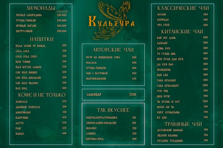 Задачей было разработать меню, концепция которого должна была подходить под заведение, которое было выполнено в русском стиле и по мотивам русско-народных сказок. Также в меню должны были присутствовать исключительно фирменные цвета заведения