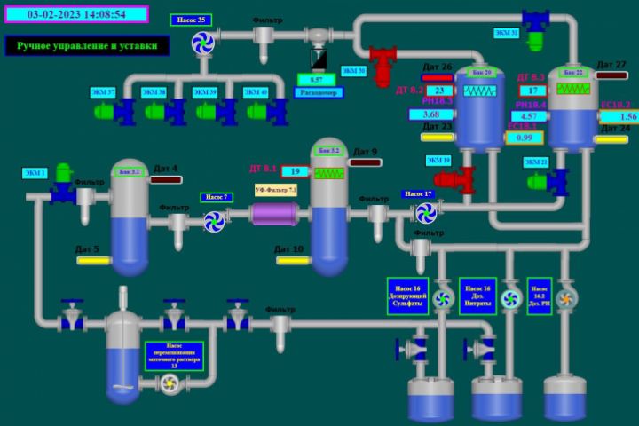 АСУ гидропоники теплицы разработана на основе управляющего программируемого реле ОВЕН ПР102. Управление насосами от частотных преобразователей российской компании "Инстарт". Верхний уровень и HMI (ЧМИ – человеко-машинный интерфейс) реализован в среде разработки MasterScada 4D от российской же компании "МПС-софт". Отличительная особенность данного проекта ЧМИ это отображение уровня жидкости в ёмкостях в дискретном режиме по кондуктометрическим датчикам уровня. Такое решение было принято для экономии средств Заказчика. Обычное решение – пропорциональное отображение по аналоговым датчикам уровня. Удалённое информирование о нештатных ситуациях посредством e-mail сообщений. Расходомер и все датчики так же российского происхождения. Проект включает в себя электрическую принципиальную схему (ЭПС), Схему расположения элементов в шкафу управления (СРЭ), спецификацию с указанием цен и ссылками на поставщиков, исходный файл управляющей программы для ПР200 и исходный файл АРМ верхнего уровня в MasterScada 4D. Заказчику нужно только собрать ШУ, подключить датчики и управляющие устройства и установить исполнительную среду MasterScada 4D на свой ПК или ноутбук.
