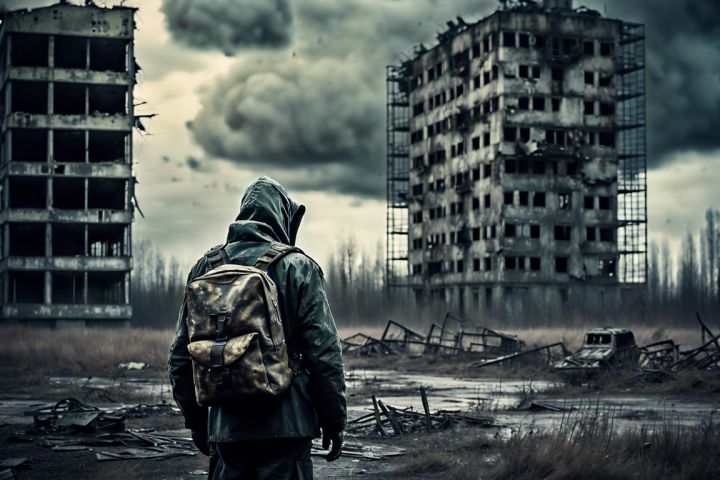 Высокодетализированный кинематографический концепт-арт сталкера Чернобыль. Мрачная атмосфера, высокая облачность, полуразрушенные постройки, здания, заброшки. В центре композиции одинокий сталкер в камуфляже с рюкзаком, гипперреалистичная живопись.