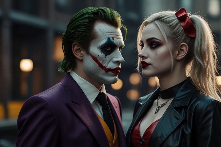 гламурный подонок Джокер гуляющий по Готам-сити со своей подружкой Харли Квин в стиле 3д