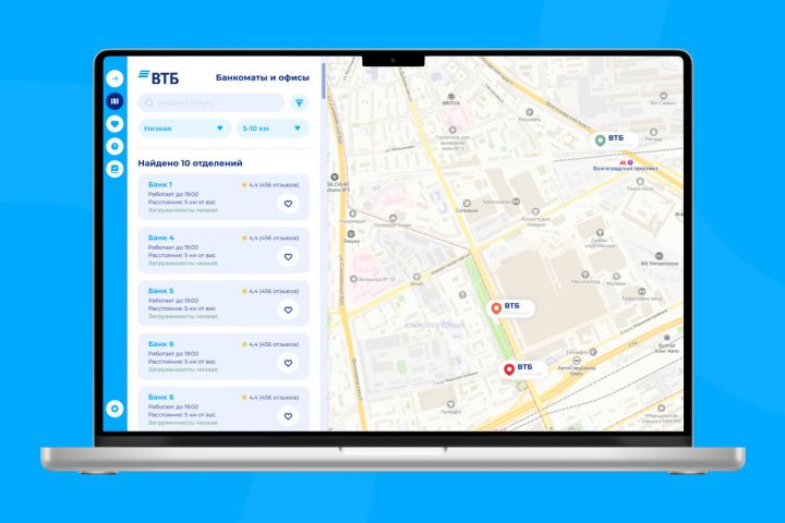 Для удобства пользователей были разработаны интерактивные карты и фильтры, позволяющие быстро находить отделения по таким параметрам, как время работы, доступные услуги и загруженность. Каждое отделение представлено в виде карточки с детализированной информацией, включая часы работы, расположение, услуги и очереди, что помогает пользователям быстро принять решение и записаться на прием. Адаптивный дизайн обеспечивает комфортное использование на любом устройстве, от смартфона до десктопа, что особенно важно для пользователей, предпочитающих мобильный доступ.