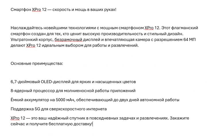 Наслаждайтесь новейшими технологиями с мощным смартфоном XPro 12. Этот флагманский смартфон создан для тех, кто ценит высокую производительность и стильный дизайн. Ультратонкий корпус, безрамочный дисплей и впечатляющая камера с разрешением 64 МП делают XPro 12 идеальным выбором для работы и развлечений.