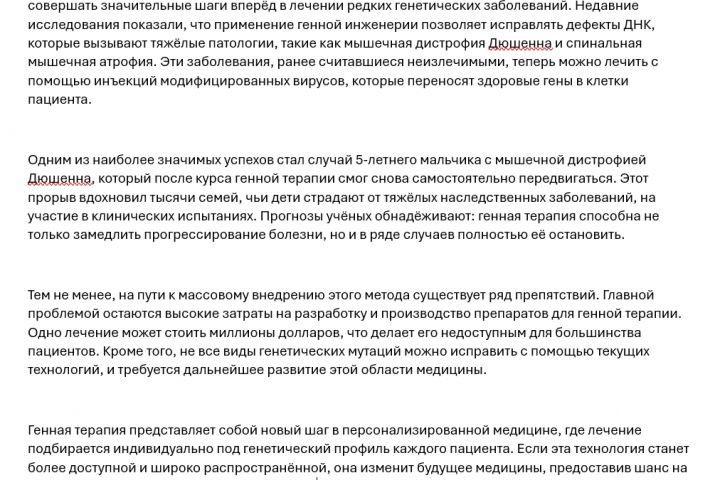 Генная терапия представляет собой новый шаг в персонализированной медицине, где лечение подбирается индивидуально под генетический профиль каждого пациента. Если эта технология станет более доступной и широко распространённой, она изменит будущее медицины, предоставив шанс на исцеление миллионам людей по всему миру.