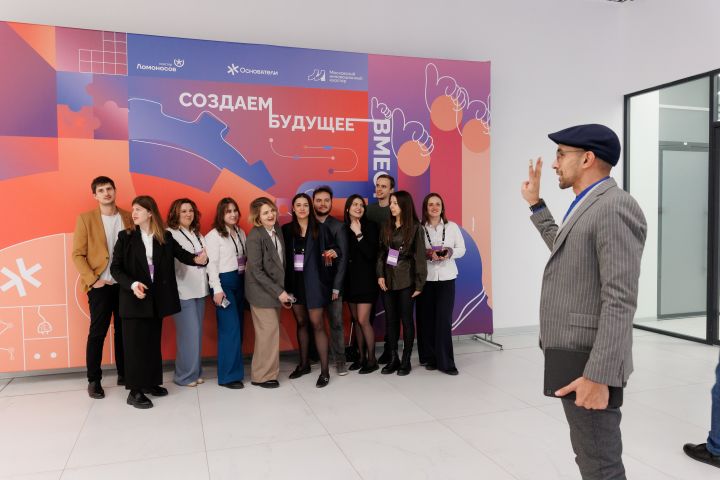 Оформление пресс-волла и полиграфических материалов создавалось в цветовой гамме уже готового стенда (тумбы) - градиент из синего, фиолетового и оранжевого цветов. Требовалось разработать яркий дизайн для молодых людей, ассоциирующийся с предпринимательством, технологиями, стартапами.