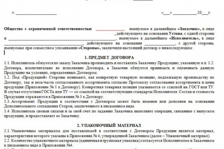 Содержание: 1. Предмет договора; 2. Упаковочный материал; 3. Патентные права; 4. Поставка продукции; 5. Качество продукции; 6. Стоимость и порядок расчетов; 7. Ответственность сторон; 8. Действие непреодолимой силы (форс-мажор); 9. Срок действия, изменение и расторжение; 10. Разрешение споров; 11. Заключительные и дополнительные положения; 12. Список приложений к договору; 13. Реквизиты сторон