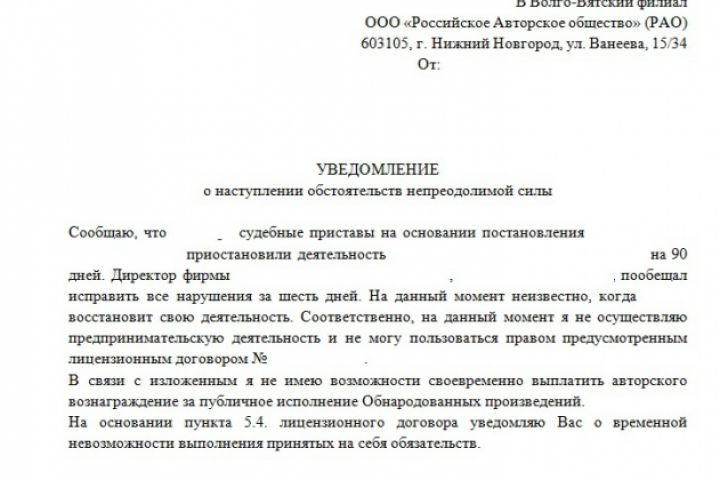 Уведомление РАО о наступлении обстоятельств непреодолимой силы