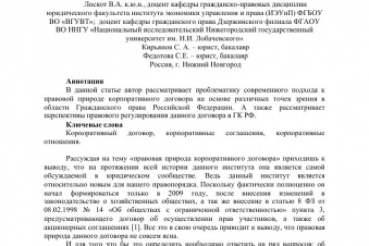 Правовая природа корпоративного договора. // Научные и творческие достижения в рамках современных образовательных стандартов: сборник материалов Международного конкурса курсовых, научно- исследовательских и выпускных квалификационных работ (15 июня 2018 г.), – Кемерово: ЗапСибНЦ, 2018 – С.90