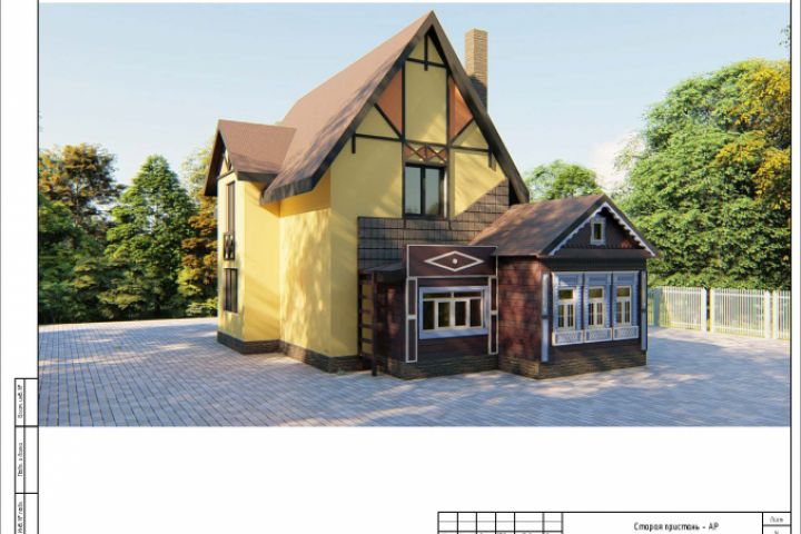 Концепция такова: приплыли с Балтики вниз по рекам скандинавы, понравилась им русская изба, и решили они её сохранить, поэтому оставили фасад, часть старого дома, а позади пристроили большой дом в своём северном стиле.