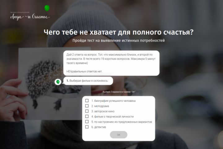 Высоконверсионный лендинг-бот. Цель: проведение тестирования для марафона самоопределения