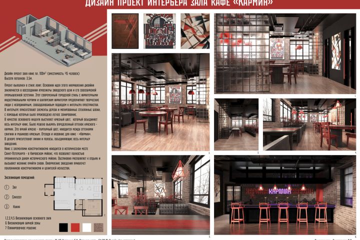 Дизайн проект интерьера для зала кафе Кармин в стиле Лофт, с использованием элементов конструктивизма. Площадь зала: 100м^2.