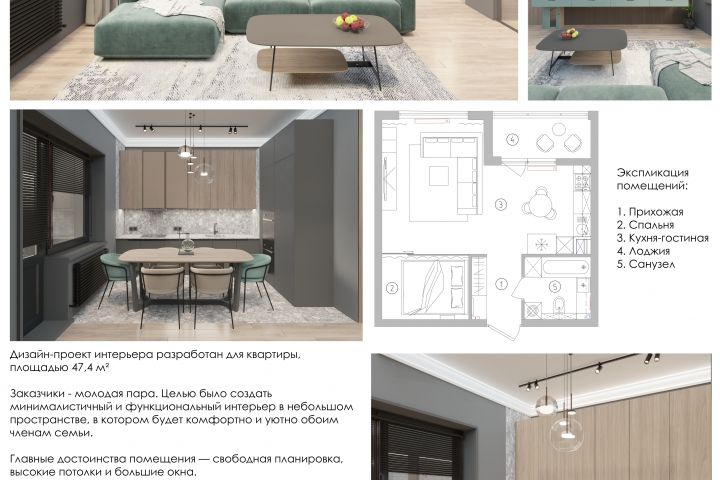 Интерьер в скандинавском стиле создан для молодой пары, площадь проектируемого помещения 47,4 кв. м.