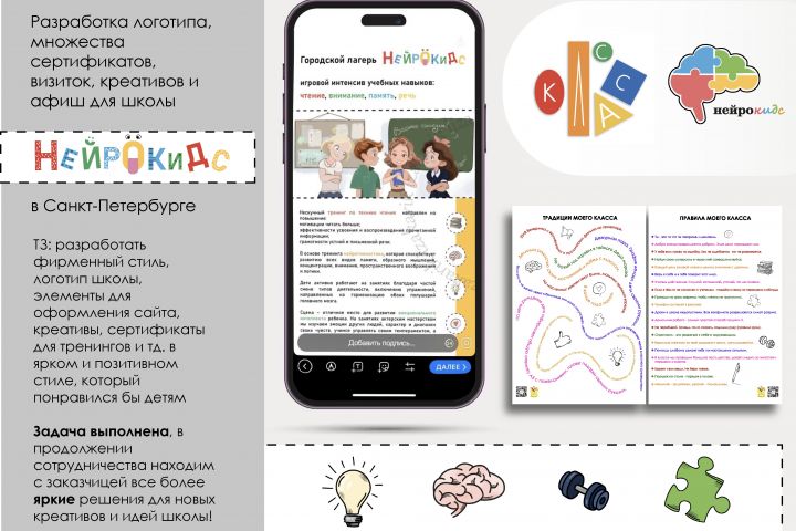 Нашей целью было создать логотип, фирменный стиль, дизайн сертификатов, визиток и стикеров для школы «Нейрокидс» в Санкт-Петербурге. Задача была в том, чтобы оформление сайта, визиток и прочей полиграфической продукции понравилось детям, а так же было яркое и веселое! Немного подробней о школе: