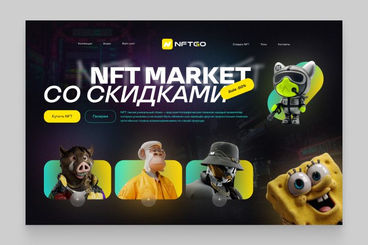 Главная страница NFT GO. Не является коммерческим проектом. Работа сделана в рамках курса YudaevSchool.
