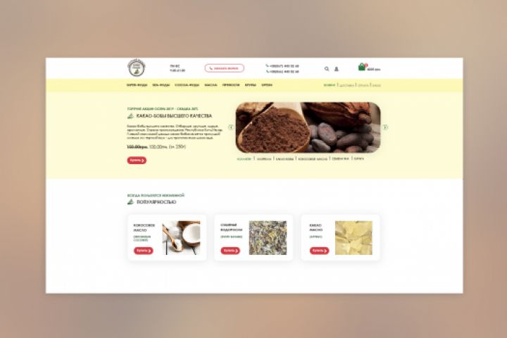 Уютный стиль небольшого магазина для веганов и сыроедов. Заказчик просил сделать определённые цвета - естественные цвета продуктов живой пищи - какао-бобов, масла какао, что-то естественное и гармоничное. С этой задачей я справилась. Логотипа тоже не было - предложила свой вариант. Карточки вышли очень уютными, чистыми, лёгкими на восприятие. Учтены разделы с историей магазина, что было важно для заказчика, а также с блогом и рецептами - именно отсюда приходит значительная часть аудитории. Важный раздел с текущими скидками помещён на первый экран.