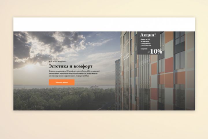 Информативный лендинг по строительству Московского ЖК "Левел Амурская". Задание стояло сделать лендинг в минималистическом стиле, свещающим основные преимущества строящегося ЖК, с акцентом на проводящуюся акцию - скидку 10% на квартиры, что я и реализовала. СТА элемент ведёт к заказу звонка (консультации). Я выбрала цвета, сочетающиеся с цветами домов комплекса. На первом экране картинкой показано одно из самых больших преимуществ - зелёная зона рядом. Лендинг последовательно проводит по всем преимуществам новостроя, акцентируя внимание на проходящей акции. Даётся вся необходимая информация по ключевым возможностям выбора и вариантам покупок недвижимости в Левел Амурская. Кнопка ярко читается, но вписывается в общую гамму. По всему видно, что ЖК продаёт престижные квартиры комфорт-класса.