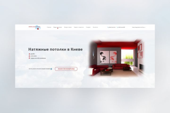 Натяжные потолки - лендинг для заказа звонка в Киеве. Я взяла восточный стиль - небо и красные элементы: красная точка - под активным элементом меню (как символ Японии), красные драконы - буллеты, красная обводка у кнопки. Очень подходит по цвету - облака и красные акценты - логотип фирмы. В то же время лендинг несёт идею лёгкости - ведь речь идёт о потолках: облака в лого и во всём фоне лендинга, слегка приглушённые, фоновые, и не только на главном экране, а через весь сайт; лёгкая незаполненная контурная кнопка. Изображение - в тех же цветовых оттенках - словно находится в облаках.