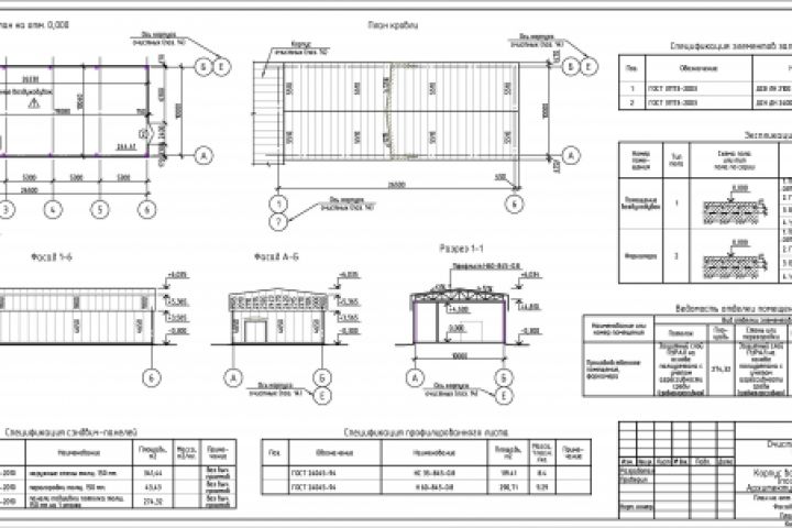 Корпус воздуходувок. План на отм. 0,000. Разрез 1-1. Фасады. План кровли.