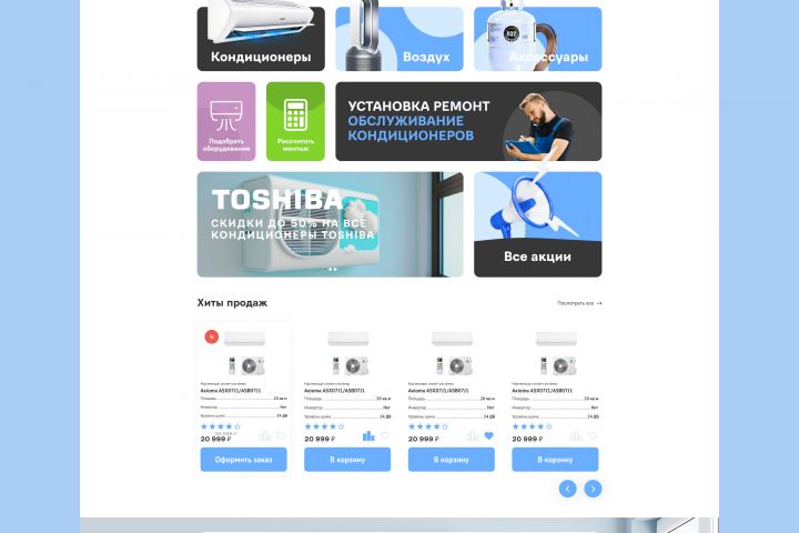Приветствую всех! Сегодня я хочу представить вам мой кейс по дизайну интернет-магазина, специализированного на продаже климатического оборудования. Моя задача заключалась в создании уникального и интуитивно понятного дизайна, который привлек бы потенциальных покупателей и обеспечил комфортное взаимодействие с сайтом.