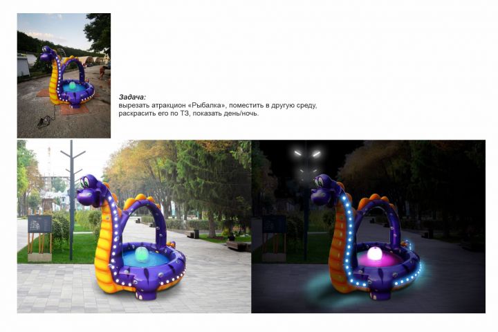 Задача - вырезать из фото изображение дракончика, поместить на фотографию парка, раскрасить по ТЗ, показать вид днем и ночью.