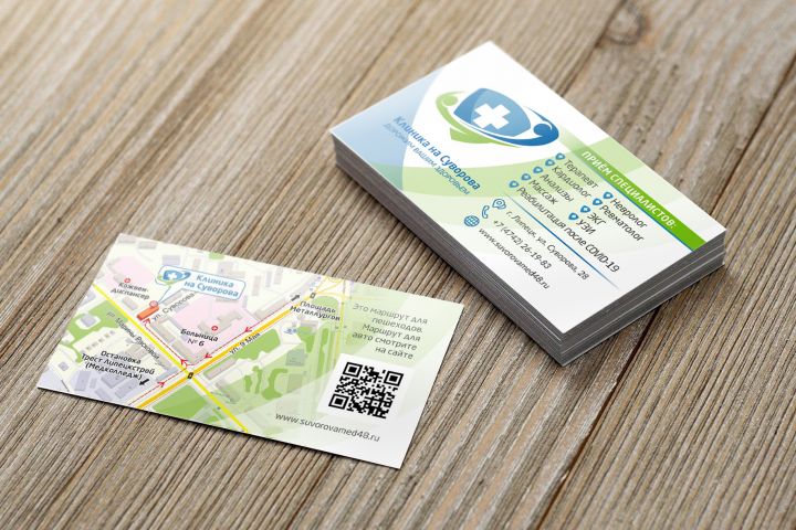 Двухсторонняя визитка. Лицевая часть - информация о компании, вторая сторона - карта со схемой проезда.