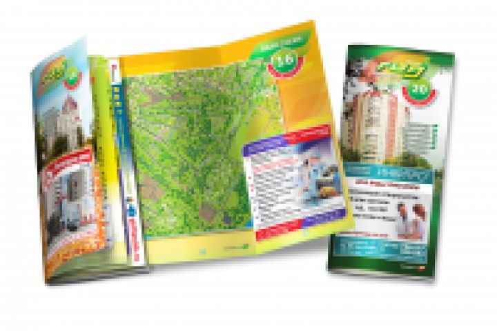 Евробуклет, многостраничный, на скрепке. Внутренняя разворачивающаяся вклейка - карта района и схема городского транспорта.