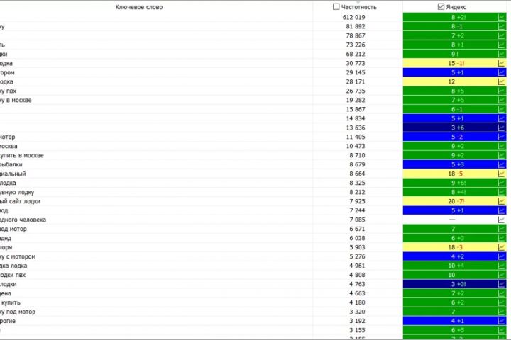 Собрали полную семантику по разделам надувных лодок и по моторам. Товаров на сайте много, поэтому почти вся семантика была реализована на сайте.