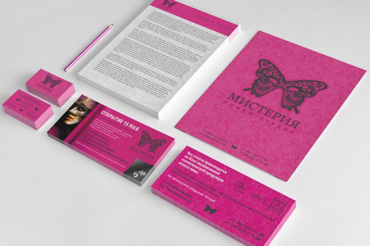 Фирменный стиль имидж студии "Мистерия". В комплект входит логотип, визитки, папка, фирменный бланк, типовая листовка, бейджи и guideline.