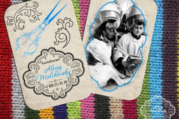 Визитки для стилиста Алексея Маликовского. Я долго думал над концепцией, в итоге решил сделать что-то необычное. Получились довольно симпатичные визитки на плотной бумаге, торец которой окрашен в приятный голубой оттенок, из эффектов применяется горячее тиснение. Подход немного юмористичный :)