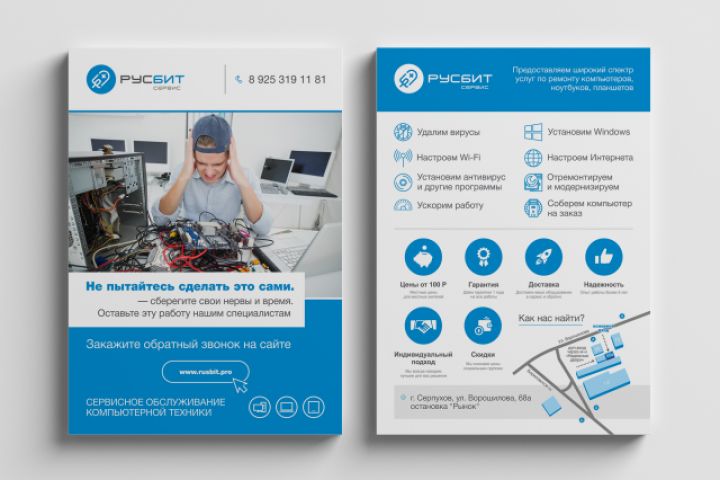 Рекламные листовки для компании РУСБИТ Сервис. В состав работы так же вошли логотип, визитки и лэндинг.