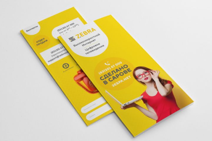 Лифлет для интернет-провайдера Zebra. В комплексе работ по созданию логотипа, полиграфии, фирменных стилеобразующих элементов, рекламных баннеров в соц. сетях