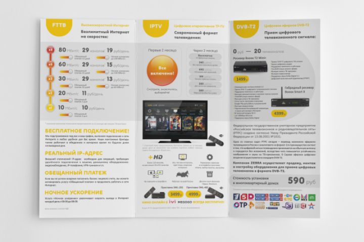 Лифлет для интернет-провайдера Zebra. В комплексе работ по созданию логотипа, полиграфии, фирменных стилеобразующих элементов, рекламных баннеров в соц. сетях