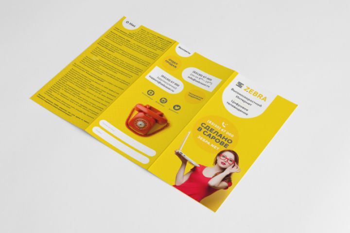 Лифлет для интернет-провайдера Zebra. В комплексе работ по созданию логотипа, полиграфии, фирменных стилеобразующих элементов, рекламных баннеров в соц. сетях