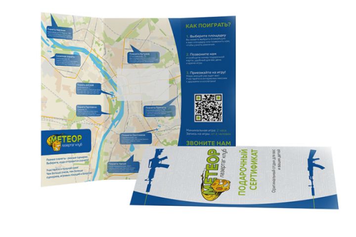 Лифлет для подарочных сертификатов с картой лазертаг клуба МЕТЕОР