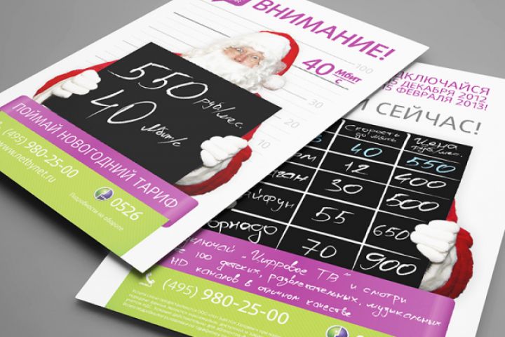 Макет новогодних листовок NETBYNET с тарифом 2013. Сетка тарифов создавалась рукописным шрифтом с помощью планшета. Кропотливая работа (: