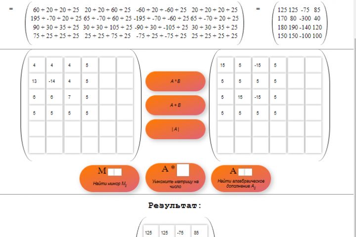 Матричный калькулятор. Умножение и сложение матриц, нахождение определителя, дополнения и минора матрицы. JavaScript vanilla.