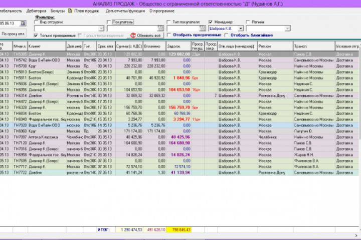 с просмотром содержания любой выбранной отгрузки. Динамически вычисляется просрочка платежа для каждой неоплаченной отгрузки. Вычисляется история просрочек оплат для каждого клиента. В модуле имеется расширенный раздел отчетов по рентабельности, а также анализа общей задолженности клиентов, с дифференциацией просроченной задолженности по срокам, а также разделы мотивации